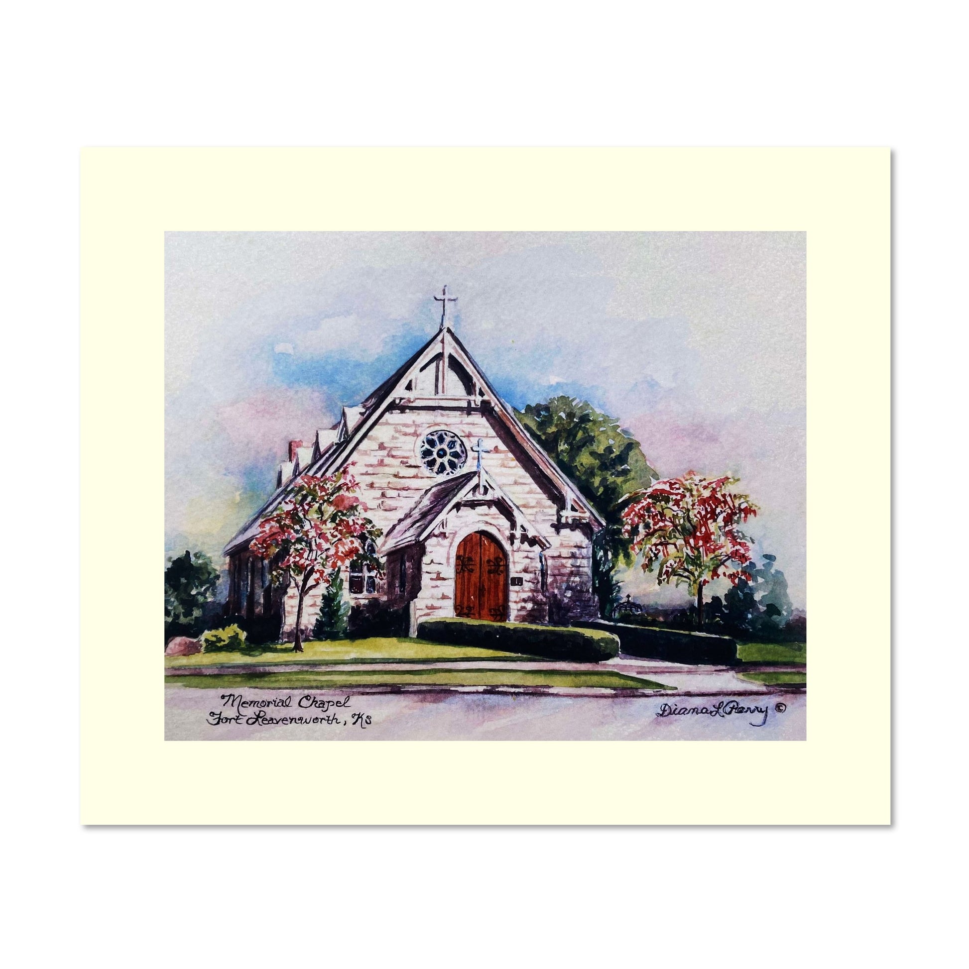 Print of original watercolor painting by artist Diana Perry. The Memorial Chapel on Fort Leavenworth was built in 1878, and still features original stained glass windows. Matted print measures 11 x 14 inches.