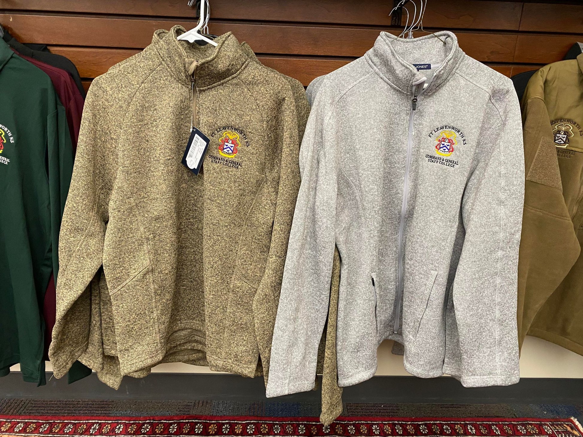 Knit zip-up sweater featuring the crest of the U.S. Army Command and General Staff College (CGSC) embroidered on the wearer's left chest. Pockets on either side. This is a special order item. Special orders are usually fulfilled within one month, but some items take longer to fulfill. Please contact the CGSC Foundation with questions - office@cgscf.org or (913) 651-0624.