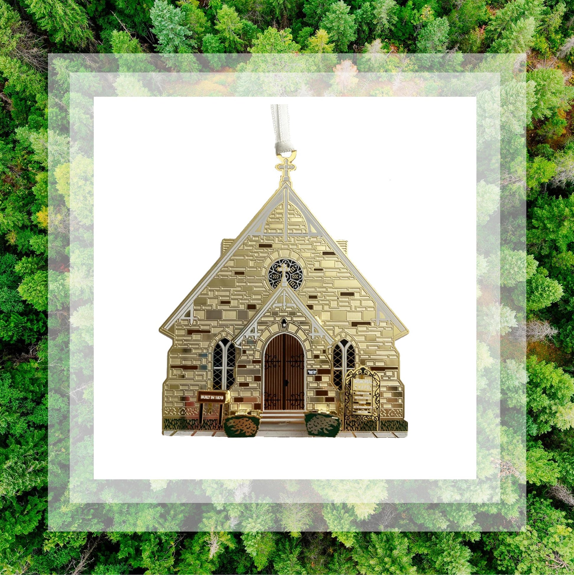 This ornament, sixth in a series, features Memorial Chapel located on Fort Leavenworth, Kansas. Built in 1878, this picturesque landmark features stained glass windows as well as plaques from past brigades stationed at Fort Leavenworth. The chapel still holds services and hosts weddings, and is a short distance from the stone wall of the original fort. This ornament was released in 2011.