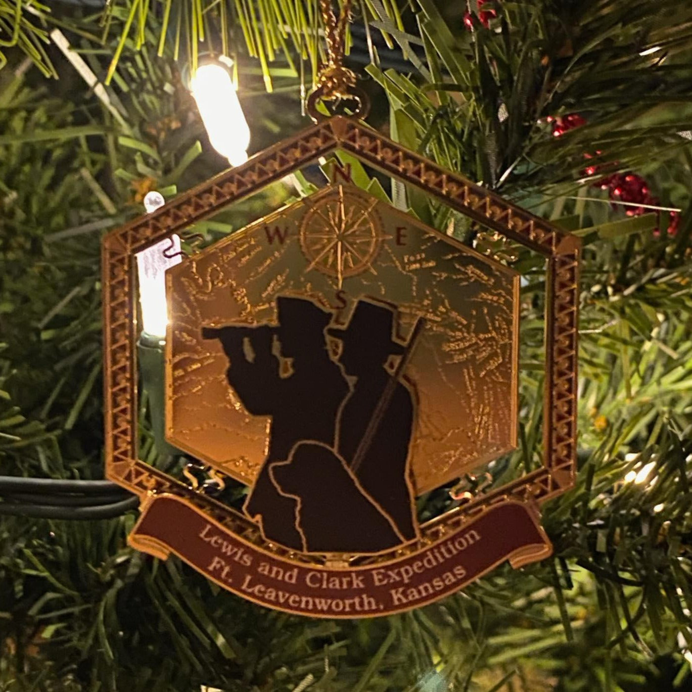 This ornament, sixteenth in a series, commemorates the Lewis and Clark Expedition - the Corps of Discovery. Captain Meriwether Lewis, Lieutenant William Clark, and the rest of the Corps explored the area that would later become Fort Leavenworth, Kansas during the expedition, and the ornament design includes a portion of their expedition map that is now Fort Leavenworth. This ornament was released in 2021.
