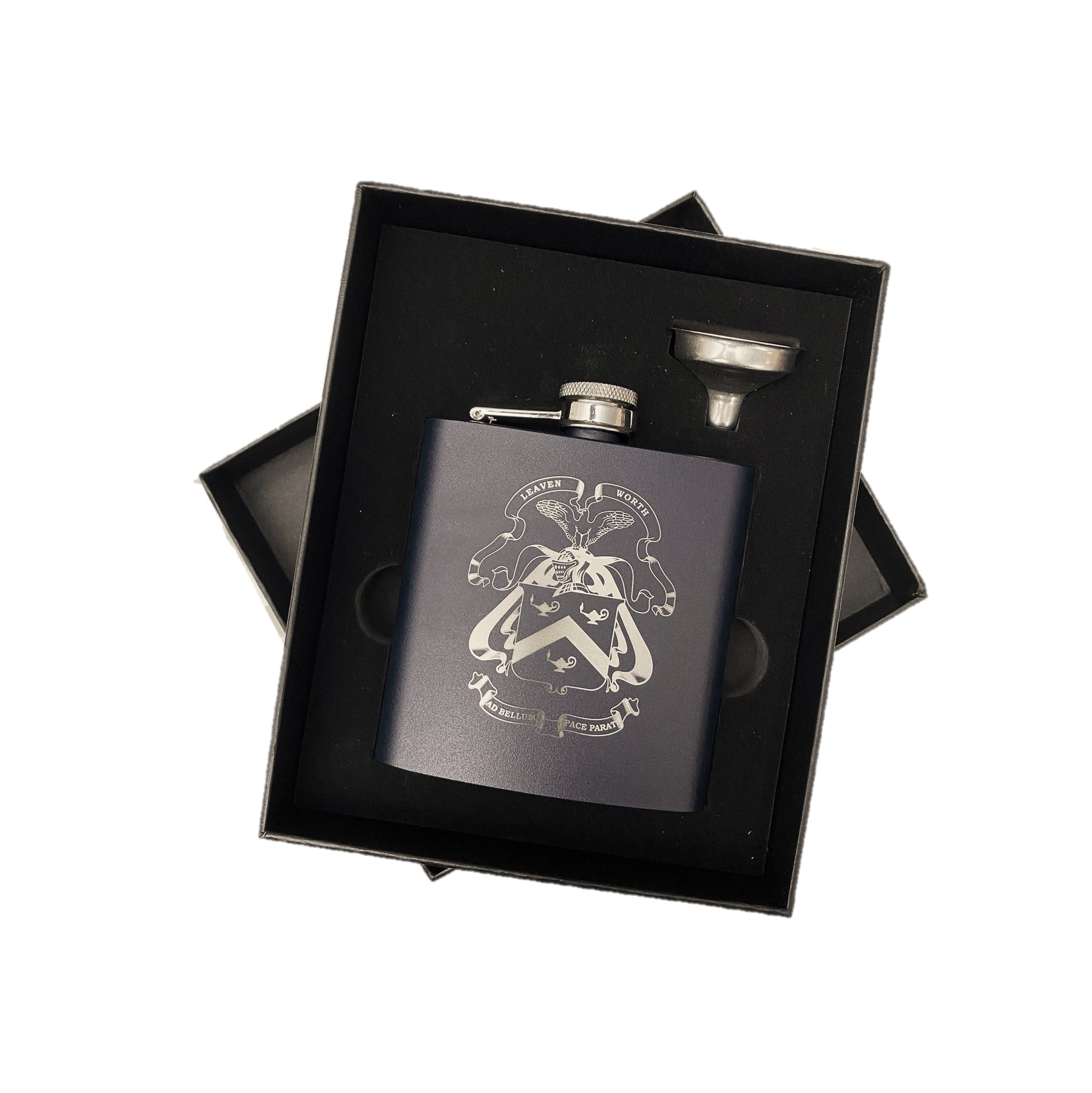 Gift set including flask featuring the U.S. Army Command and General Staff College (CGSC) crest, funnel, and gift box.
