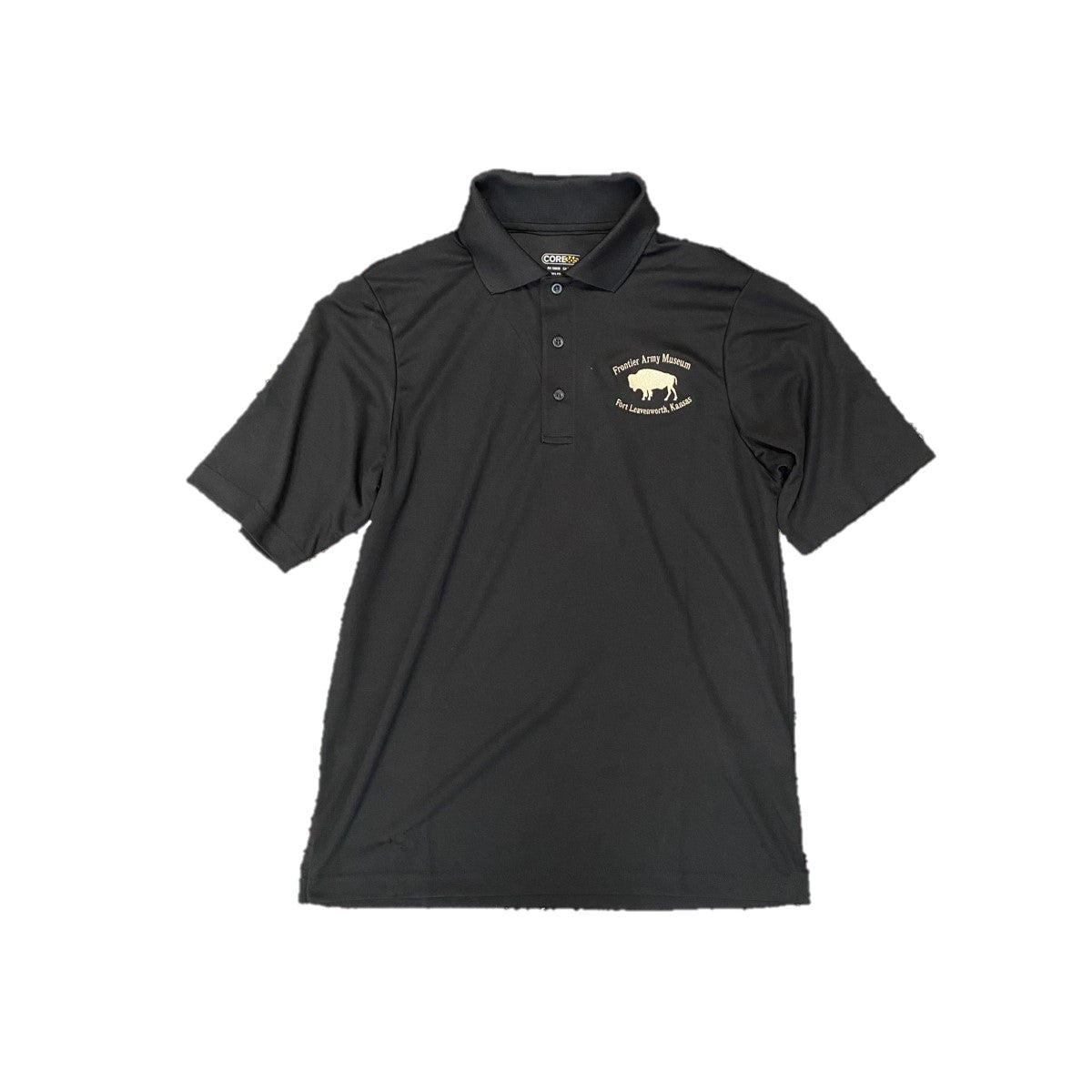 Short sleeve black polo featuring the logo of the Frontier Army Museum at Fort Leavenworth, Kansas embroidered on the wearer's left chest.
