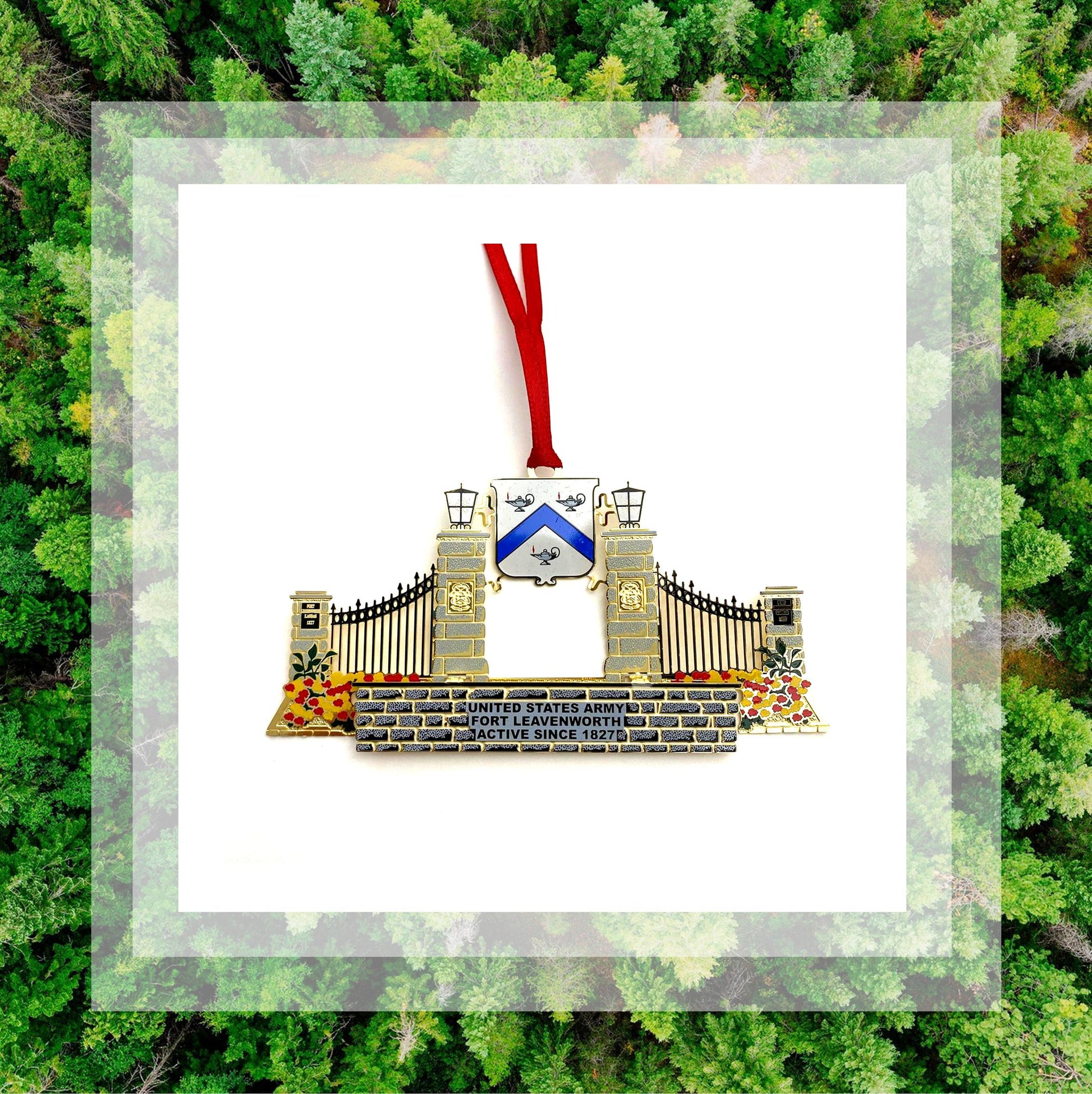 This ornament, fifth in a series, features the front gate of Fort Leavenworth, Kansas. Fort Leavenworth, known as "The Post that opened the West" and “The Best Hometown in the Army,” was established in 1827 and is one of the oldest continually operating forts west of the Mississippi River. The fort is also the home of the U.S. Army Command and General Staff College. This ornament was released in 2010.