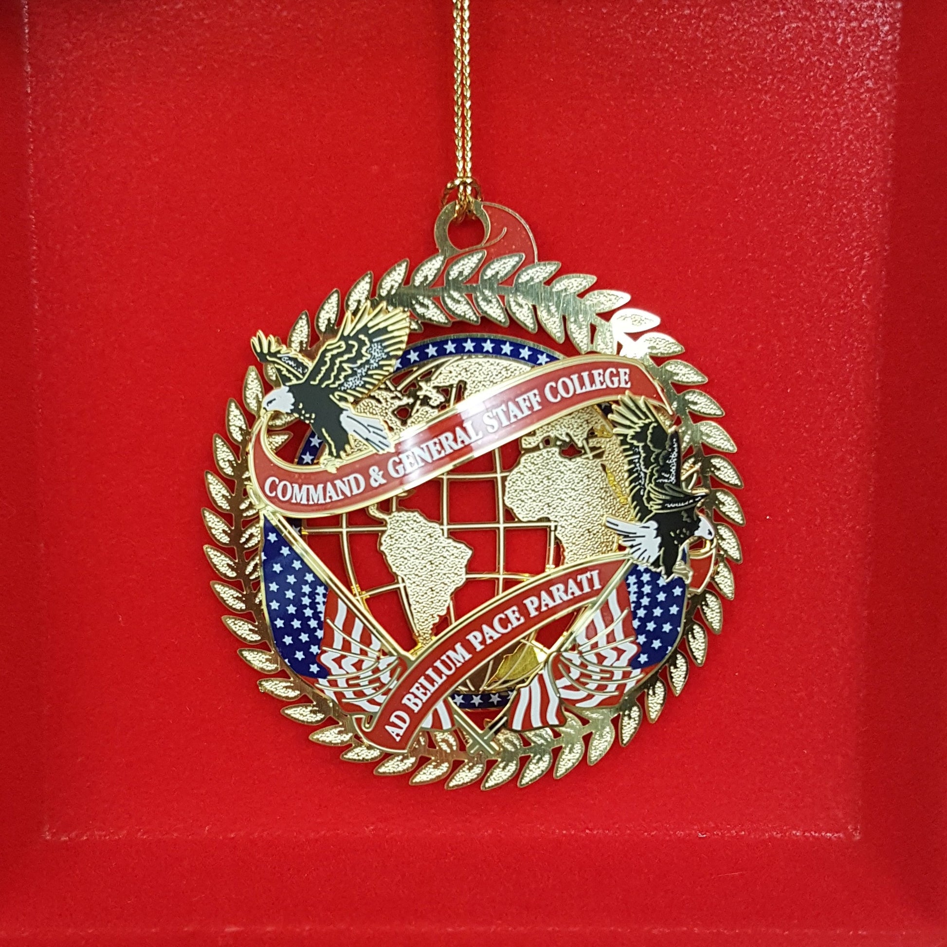 This ornament, seventh in a series, features the Latin motto of the U.S. Army Command and General Staff College - Ad Bellum Pace Parati, or "Prepared in peace for war." The design includes the U.S. flag, eagles, and a globe surrounded by a laurel wreath. This ornament celebrates the thousands of international military officers who have attended the College since 1881. This ornament was released in 2012.