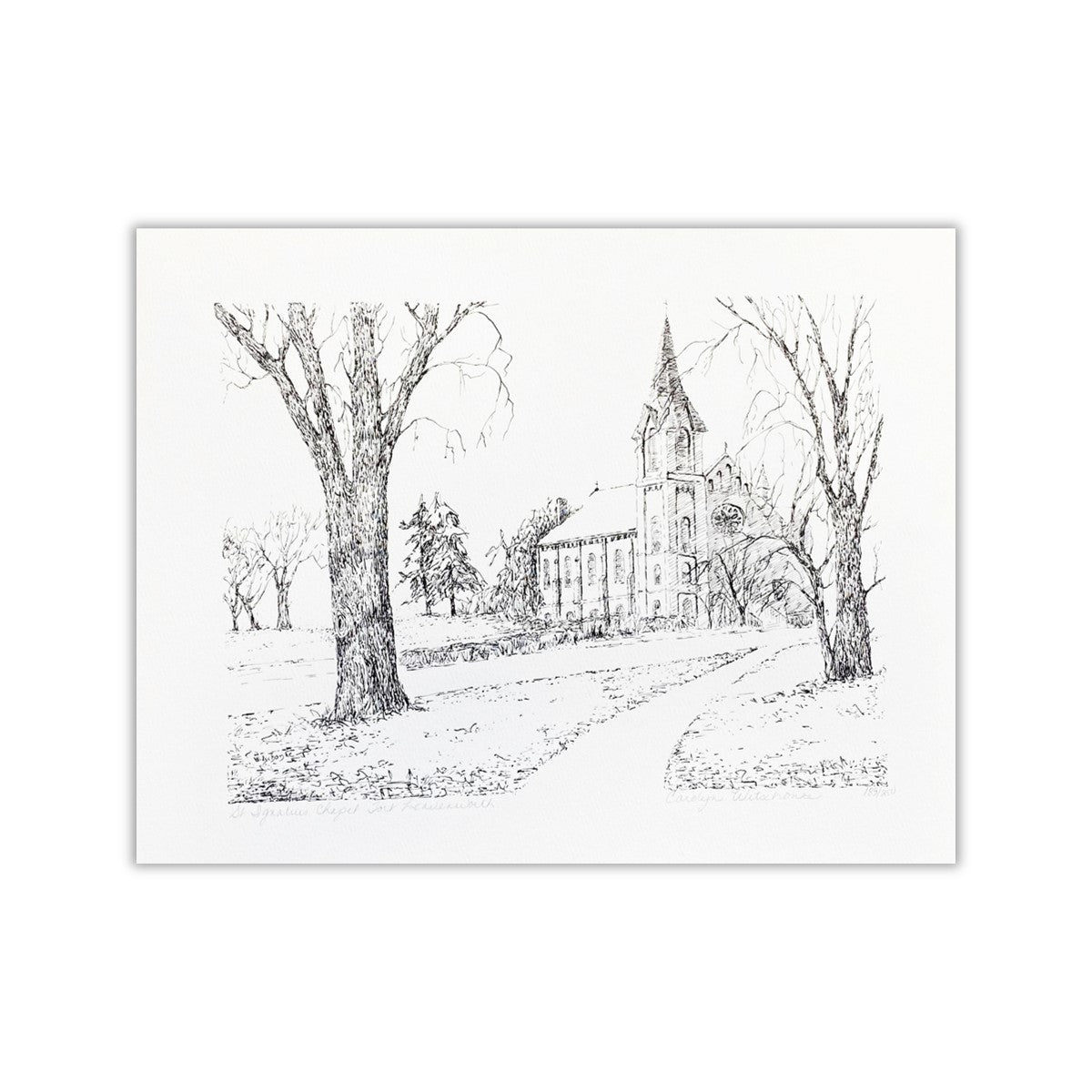 Black and white print of Saint Ignatius Chapel pen and ink drawing by artist Carolyn Witschoke - 11 x 14 in.