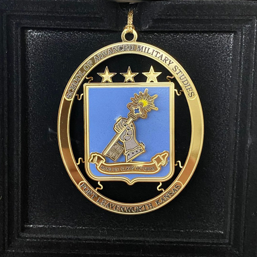This ornament features the crest of the School of Advanced Military Studies (SAMS). As part of the U.S. Army Command and General Staff College, SAMS educates members of the United States Armed Forces, U.S. Allies, and personnel from U.S. government agencies at the graduate level to become agile and adaptive leaders. This ornament was released in 2023.