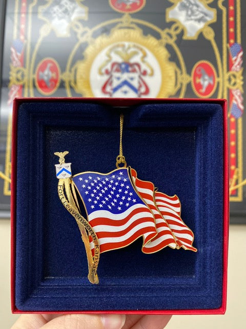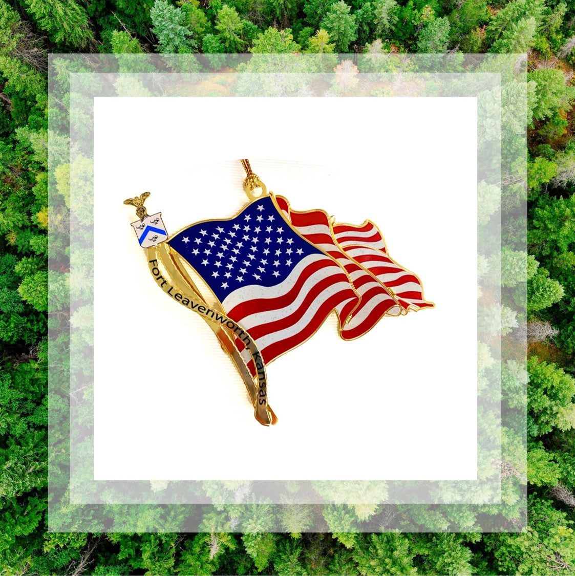 This ornament, fourteenth in a series, features the flag of the United States of America, and is the first ornament in the series to feature “Old Glory” center stage in the design. The flag’s classic red, white, and blue are set-off by gleaming brass, and the finial features the crest of the U.S. Army Command and General Staff College. The banner reads “Fort Leavenworth, Kansas.” This ornament was released in 2019.