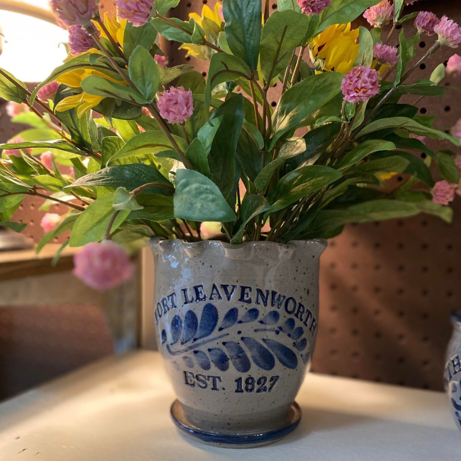Planter with attached saucer by Westerwald Pottery. Approximately 6 inches tall. Hand made in the USA.